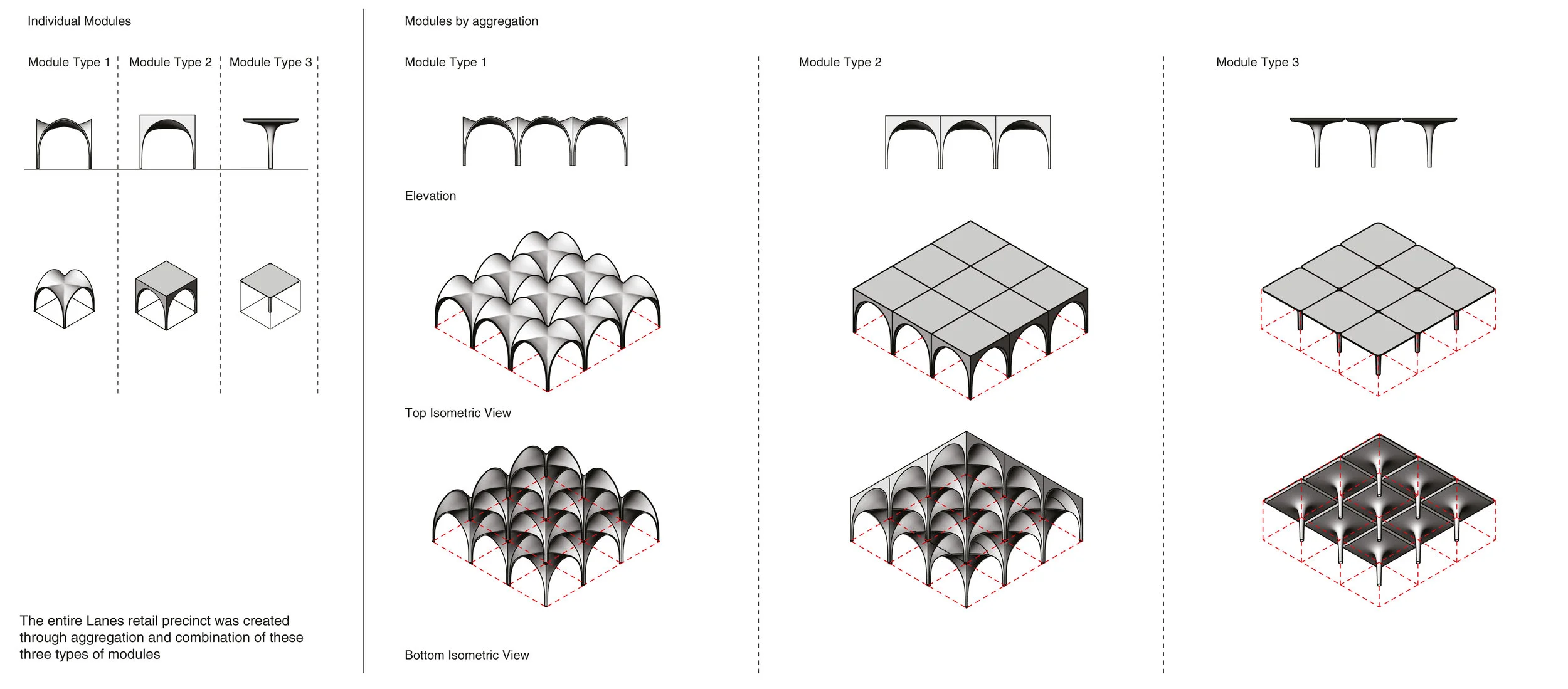 Moving away from conventional modules typically defined by a slab and four columns, we decided to work with a structural system that could provide more variety and dynamic spaces. Implementing the most natural form of structure- an arch, three different module typologies were created providing sufficient variety to define the entire Lanes Masterplan.